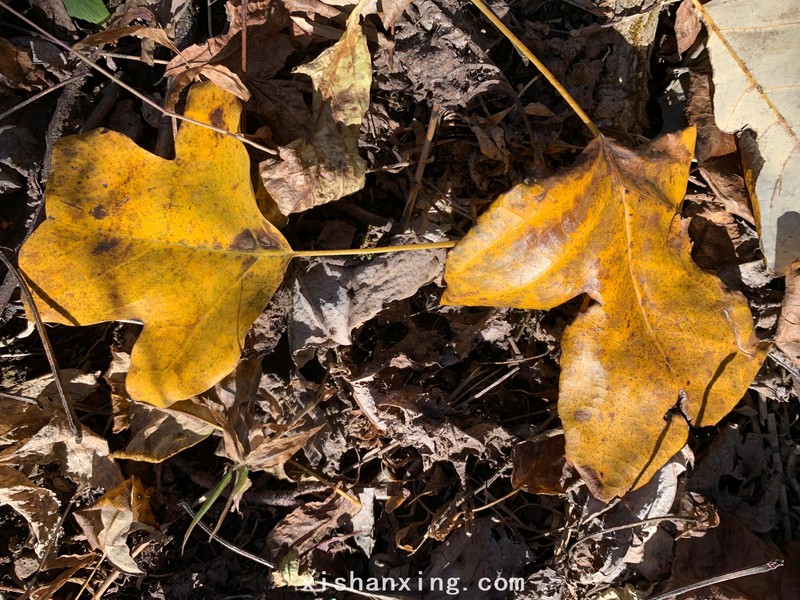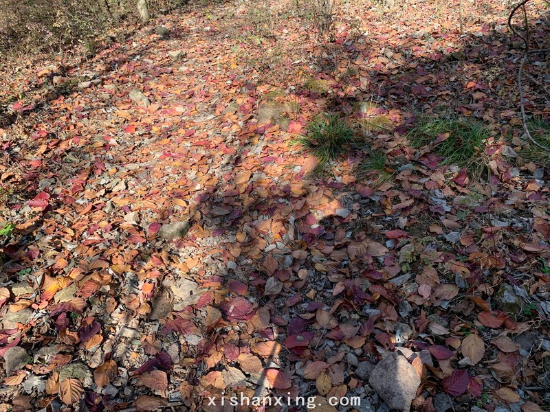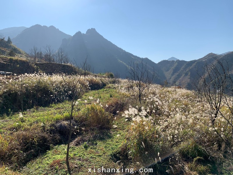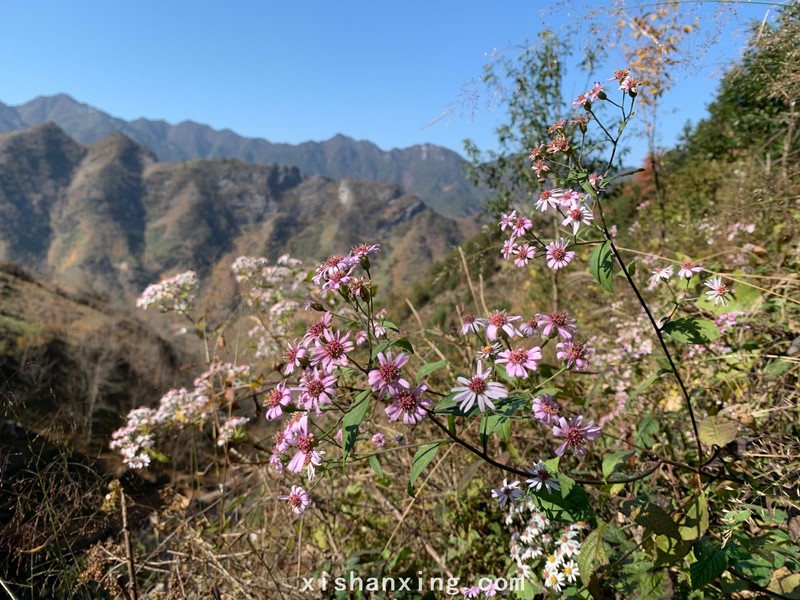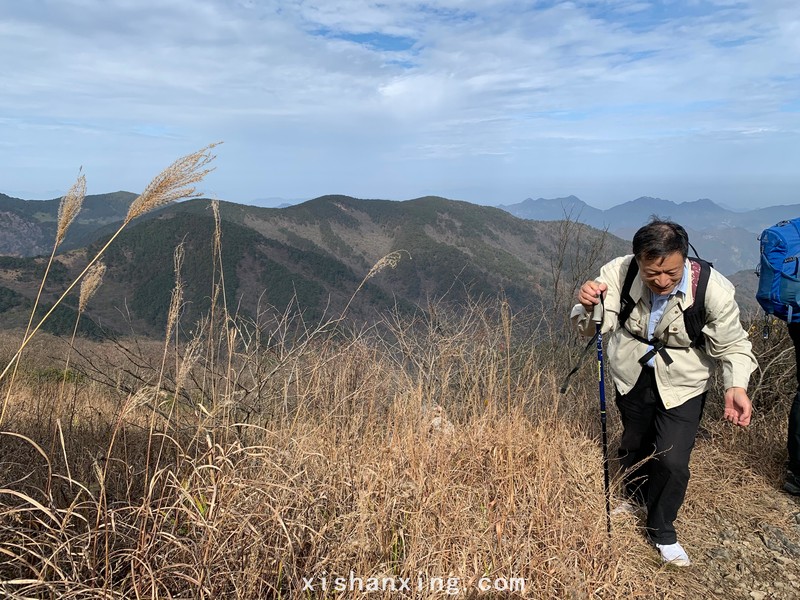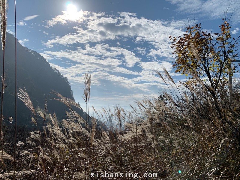 缓过劲来以后才有余力欣赏野山的风景,走过浙江的许多大山,跟随西山行走遍了西湖群山,都比不上这里的山野,这里基本看不到行走山道的台阶、看不见人影、看不见任何的建筑物。满目野花、芦苇、落叶外,就是流水、悬崖,除了远处起伏的山峦,剩下的就是那蓝蓝的天空,这里听不见一点声音。静悄悄的山林充满神秘的力量,让每一个来到这里的人都会产生敬畏之心。