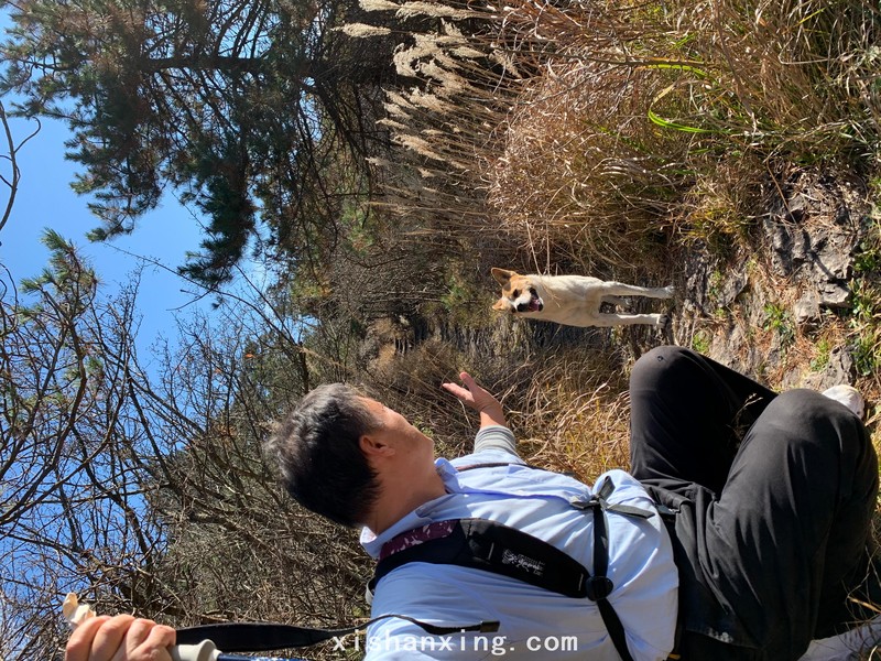 一条黄狗悄无声息地跟了上来,它的一条腿瘸了,一点都不怕人,给它东西吃,它还挑着吃。它会乖乖地蹲在你身旁一起合影,看起来非常熟悉来这里登山的人。