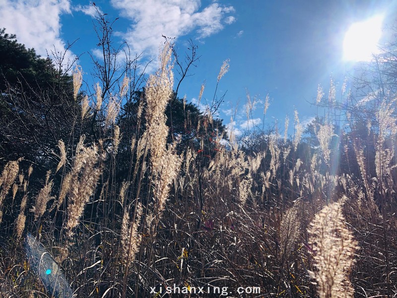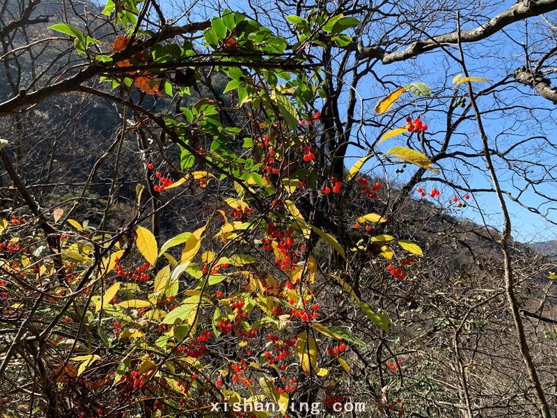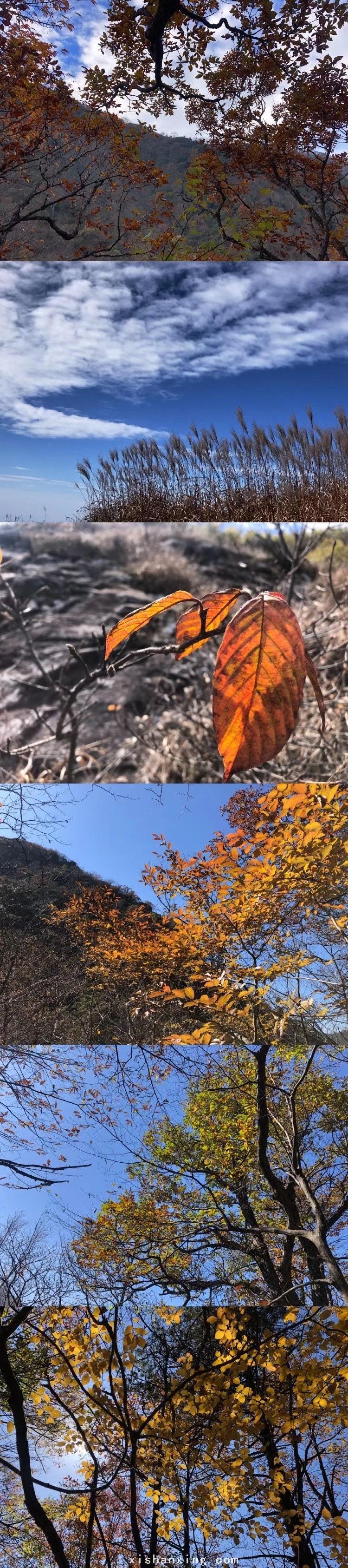 秋在这里得到充分体现,红叶,黄叶在阳光下非常醒目、树枝丫上挂着红色小果子,树下黄黄、红红的叶子洒落了一地,各种颜色的野菊花、紫色、绿色野花在秋天阳光下摇摆,蒲公英的粉球随风飘洒,野草黄了,芦花白了,踏着秋天的脚步伴随我们走向清凉峰顶。
