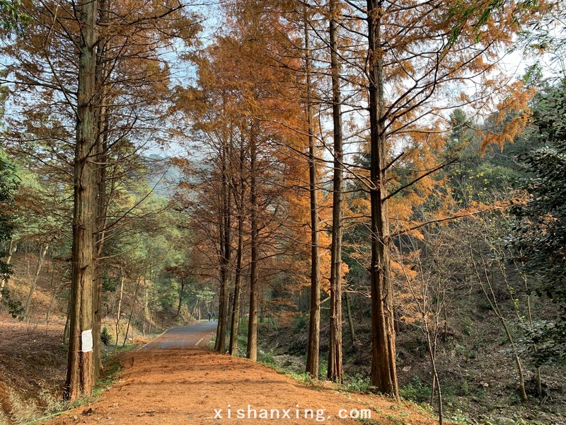 在林场稍作休整后向白龙潭景区出发,一条水杉林落叶敷就的路面展现在我们的眼前,路面上厚厚的黄色水杉树叶,两侧矗立着高大的杉树,整个场面在午后阳光的照射下呈现一片金黄颜色,非常好看。