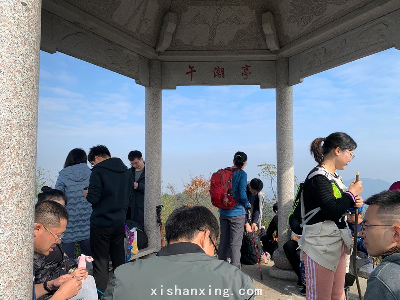 走出野路来到一条长长的台阶路上,已经十分疲惫,咬咬牙一口气走上数百个台阶来到午潮山的顶端午潮亭,这里海拔高度约500米,时针指向12点钟,大家围坐在亭子里开始吃午饭。
