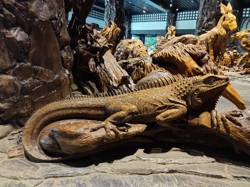 整个展馆其实相当于木雕的动物园。馆内成列的”动物”很多,有大象、麋鹿、角马、袋鼠、蜥蜴、老虎等等,还有一些侏罗纪时代的史前物种,剑龙、马门溪龙等等。每一个根雕作品都把每个动物的特点刻画的异常分明,在细节上也刻画的非常细致,就仿佛是真的动物一样。靠近墙面的动物根雕后面的布景都是彩色的,墙上是用油彩画出的动物的生活环境,使整个展馆显得不在单调,因色彩的加入反而多了几分童趣。在馆内走了一圈,除了可以欣赏到栩栩如生的根雕以外,墙面上的壁画也是个极佳的欣赏对象。