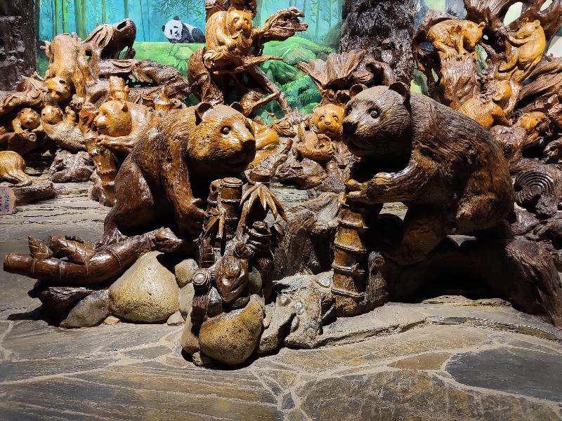 一群熊猫在森林里扒拉着竹子有的爬上了树梢,有的嘴里含着竹叶在不断地咀嚼着,有的怀抱幼崽,每一个根雕都刻的非常有趣,把熊猫宝宝可爱憨厚的形象刻画的分明。