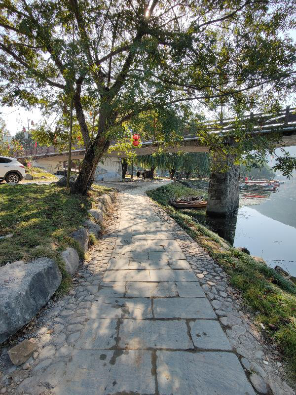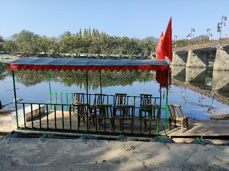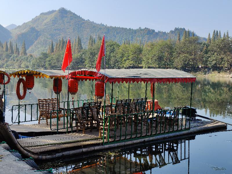 有水就会有船只,岸边会有飘着红色灯笼和国旗的船只,拱形的红色船顶防止阳光直晒,也保证了一定的速率,船面很宽,两旁有围栏和靠椅,方便游客乘船游览这山、这水。小船儿摇摇摆摆淌着水流前行,红色的灯笼也随之轻轻摇动,面对这幽静的山水,仿佛置身于江南烟雨中,船夫淡然的摇曳着船桨,人们坐在船上,只感觉到岁月静好。这样的感官盛宴,谁能拒绝呢?
