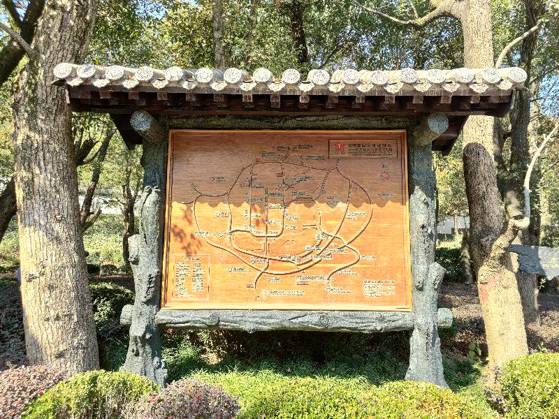 我迎着石阶而上,头顶上是“半盏”日光,在一瞬间,晃了晃眼,照的我生疼。我坐在石阶上小憩,闭上眼,感受着自然的风。稍息片刻,又继续前行,不远的墙上挂着景区的游览图。跟其他景区的游览图不一样,这里的游览图都是用木板刻上去的。可谓真是无处不在的木雕啊,细节做得是恰到好处。