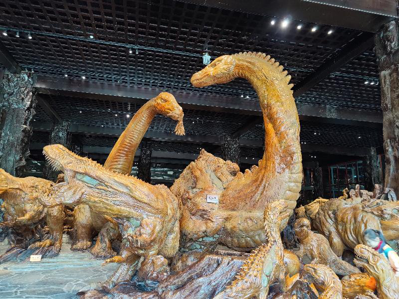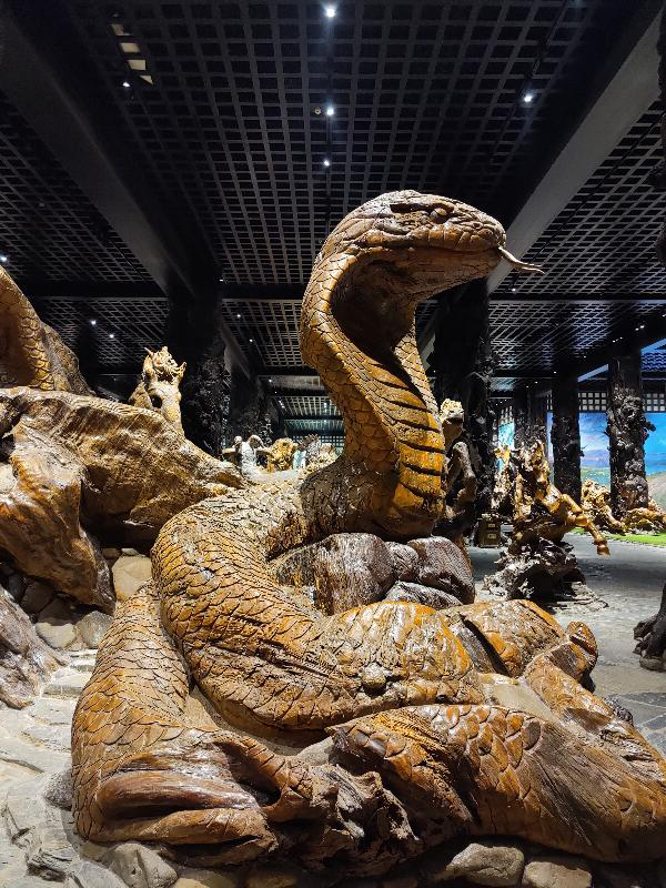 整个展馆其实相当于木雕的动物园。馆内成列的”动物”很多,有大象、麋鹿、角马、袋鼠、蜥蜴、老虎等等,还有一些侏罗纪时代的史前物种,剑龙、马门溪龙等等。每一个根雕作品都把每个动物的特点刻画的异常分明,在细节上也刻画的非常细致,就仿佛是真的动物一样。靠近墙面的动物根雕后面的布景都是彩色的,墙上是用油彩画出的动物的生活环境,使整个展馆显得不在单调,因色彩的加入反而多了几分童趣。在馆内走了一圈,除了可以欣赏到栩栩如生的根雕以外,墙面上的壁画也是个极佳的欣赏对象。