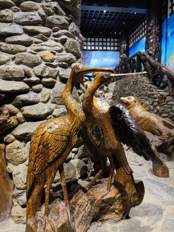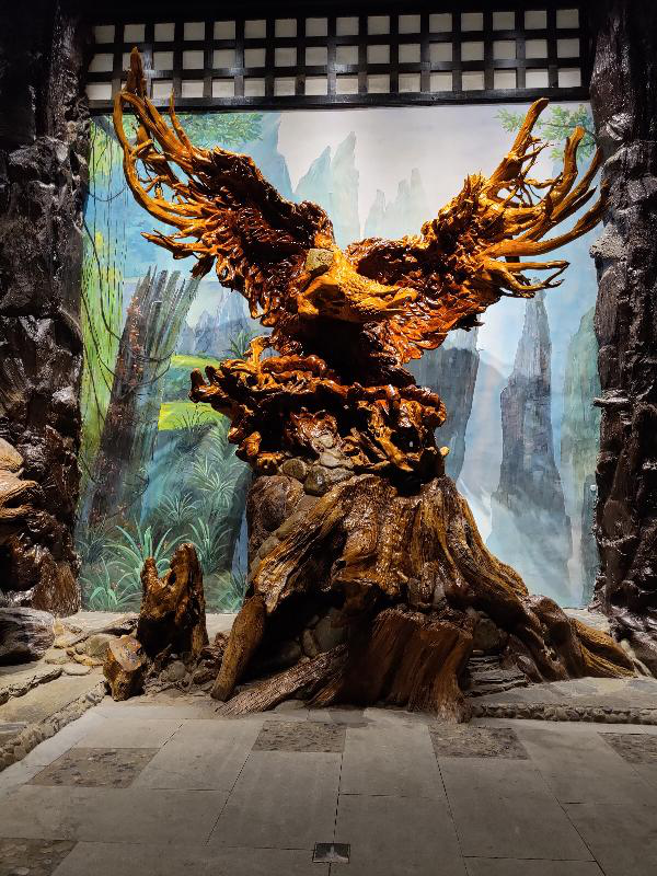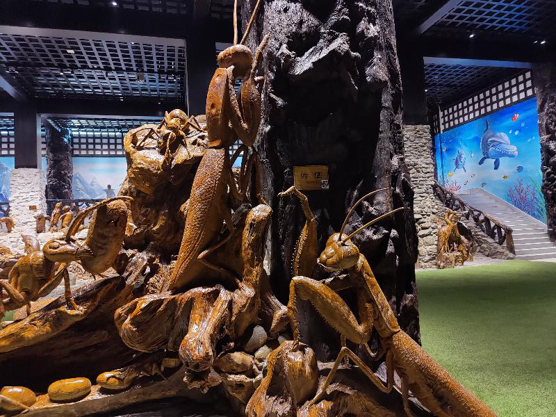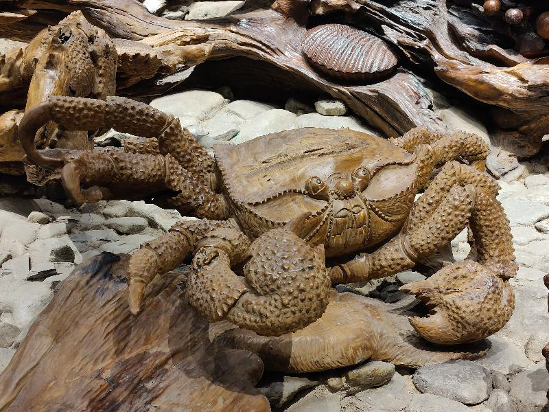 一个满是山涧的壁画前面,一只雄鹰在山顶扑腾着它的翅膀正打算展翅翱翔于这广袤的天地之间。一个干涸的水池里,各种青灰色的不规则石头铺成的地面之上,一只只大龙虾,大螃蟹在池子里爬行。仔细一看,螃蟹的两个大钳子上凹凸不平的纹路都刻画的如此分明。像这样的细枝末节都能把握的这么好,实在感叹根雕大师炉火纯青的高超技艺。