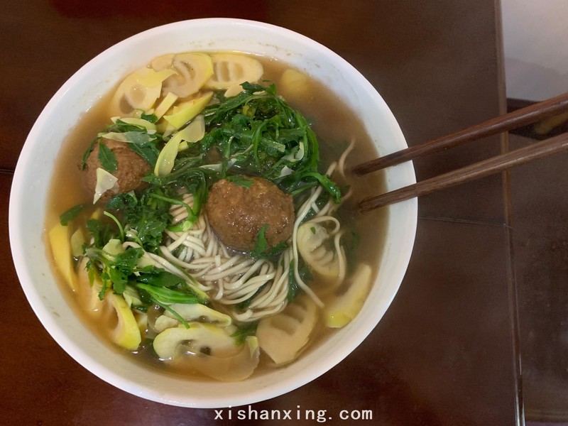 同车的小姑娘挖了荠菜,刚好给我回家下面条吃,正宗的富阳新沙岛荠菜加上笋片,狮子头给了一顿美美的晚餐。