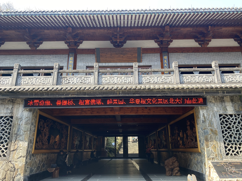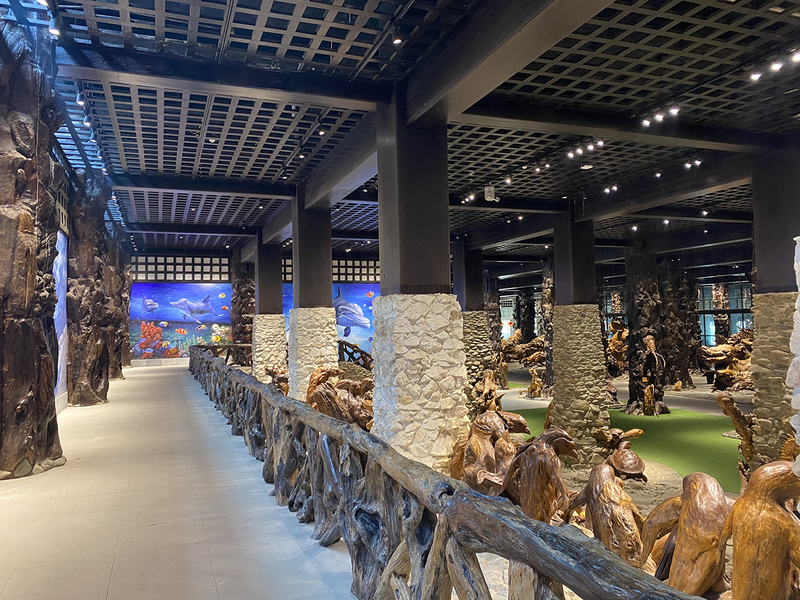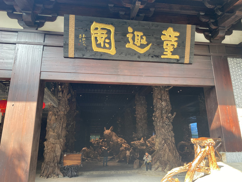 我们来的时候恰巧景区是免门票的,幸运极了,我猜想可能是因为疫情的关系,也可能是过年的福利延至今日还未结束。景区北大门是用奇石雕刻而成,镂空的设计,别致的墙面,使整个大门看起来更加的有气势。回廊俩边的墙壁上展示着一幅幅的根雕作品,木质的凳子上有游客在这闲坐,但他们更像是在探讨着根雕的奇妙。