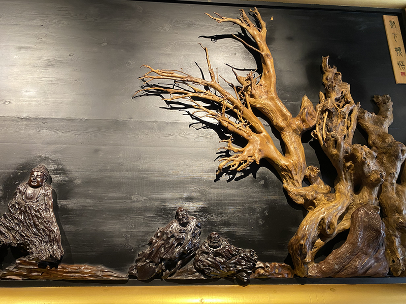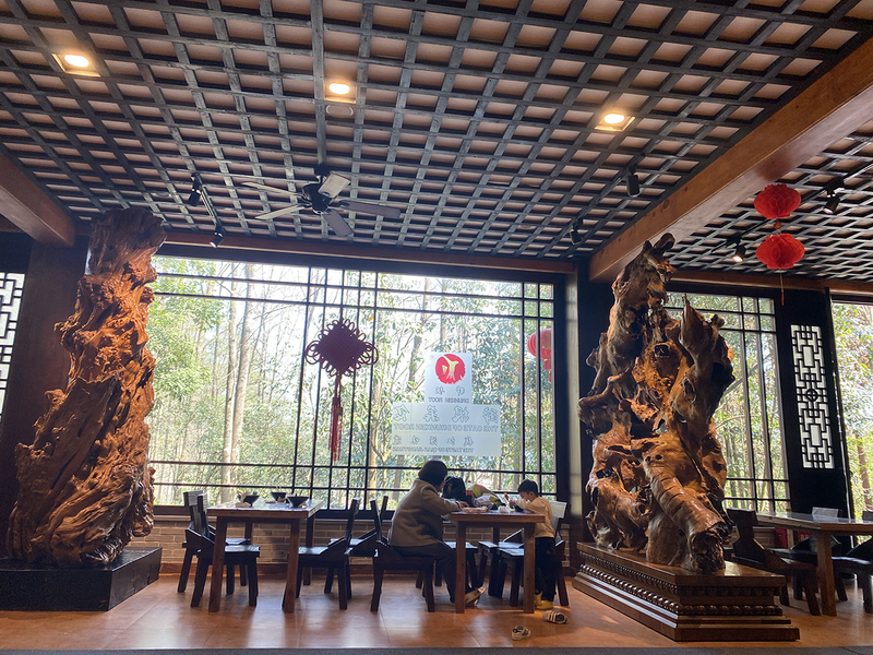 玩的累了乏了,园内还提供餐厅给自己补给充电,味道蛮不错,价格也公道。走进第一眼看去,哇,天花板是木制品,门是木制品,连桌椅也是木制的,真的就差餐具了。里面还有几个偌大的根雕,瞬间提高了餐厅的档次,使其和这根博园更加相称,这些“庞然大物”高高的树立在餐桌之间,像是在守护着每一位用餐的客人。