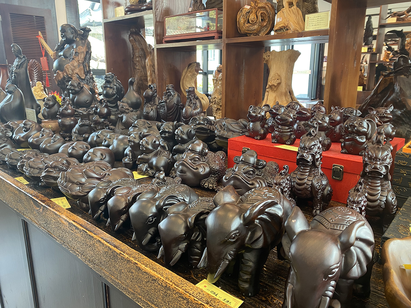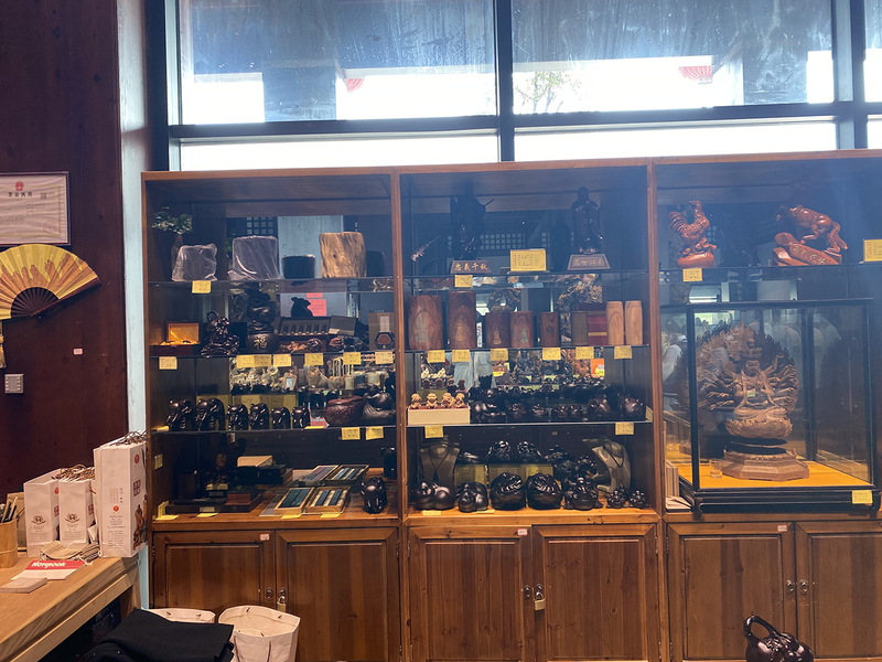 如果说园内根雕艺术品禁止触摸,禁止外带是件憾事,那你可以来这个小店,店内摆放着各式各样精美的小件雕刻作品,明码标价,供游客选择购买收藏,价格由十几至几百上千都有,看你如何选择。我也是挑选了几个自己中意的小物件带它们回家。