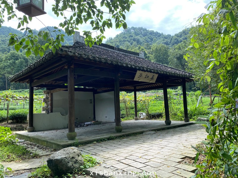 龙井茶室总是处于修缮状态,龙井泉还是可以进去看的。走龙井八景一线风景特好,一座小桥的后面有一条十分隐秘的小路,小路相伴着一条溪流蜿蜒向前,远处的群山和山下的茶树相伴一路前行,走过一座凉亭,屋檐下的横梁上书“真如亭”三字。