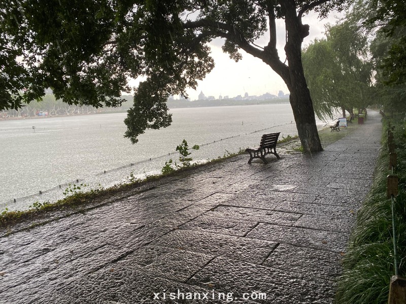 走孤山去白堤,一场大雨不期而至,大风夹着大雨横扫湖面,大量微小的水汽在空中飞舞,这样的雨里面有伞也显得苍白,所有人老老实实围坐在放鹤亭里避雨,在凉爽的空气中观赏这难得一见的西湖美景。