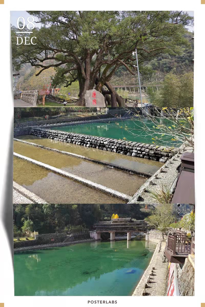 靠近河边有一颗巨大的古 樟树 ,它的枝干粗壮,向四面八方伸展开来,即使是在寒冷的冬天里, 樟树 的枝叶依然繁茂翠绿。 樟树 已历史1200多年,像一个饱经风霜的老人一样,看遍了花开花落 ,春去秋来,年复一年,日复一日,横穿了历史的洪流,也见证了村落的兴衰繁盛,保护着这一方的子子孙孙。被一阵喧闹声音吸引,古樟前的戏台子前聚满了人,皆是一群头戴小蓝帽的游客,戏台之前锣鼓喧天,在一阵热闹之后,别开生面的畲族特色的表演开始了。先是一个小哥上来了一阵杂耍,“高空抛物”,我也不知道这个小哥是怎么做到抛出装满水的容器还能这么游刃有余的把玩,最奇特的是,滴水未落。在我还回味在这个表演之中,下一个表演更让我为之一颤。一个架子上有六个木桩,人置于中间,另一个人朝着木桩上扔斧头,我着实为那个站在中间当靶子的小哥捏了把汗,小哥死死的用安全帽护住自己的重要部位,在扔最后一个斧头的时候,当靶心的小哥吓了一跳,躲了一下,还好斧头完美的落在木桩之上。
