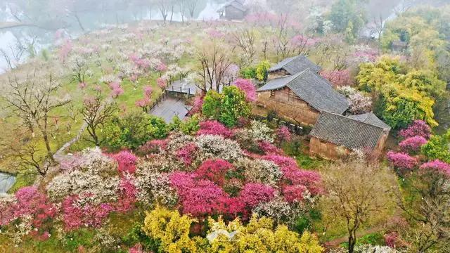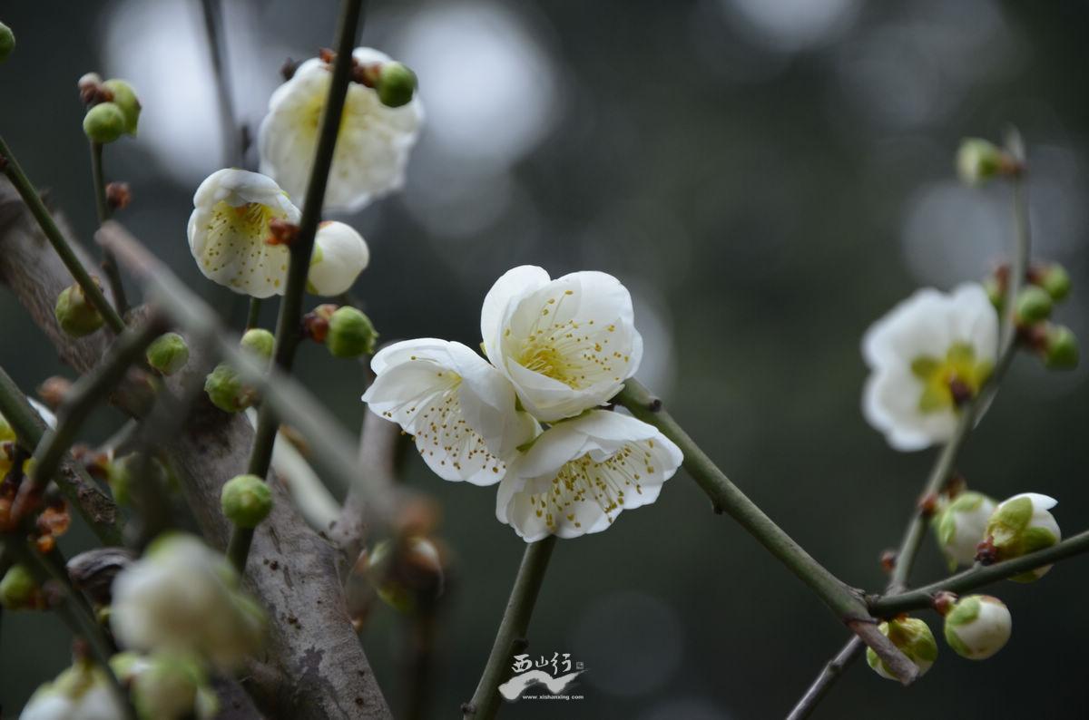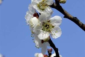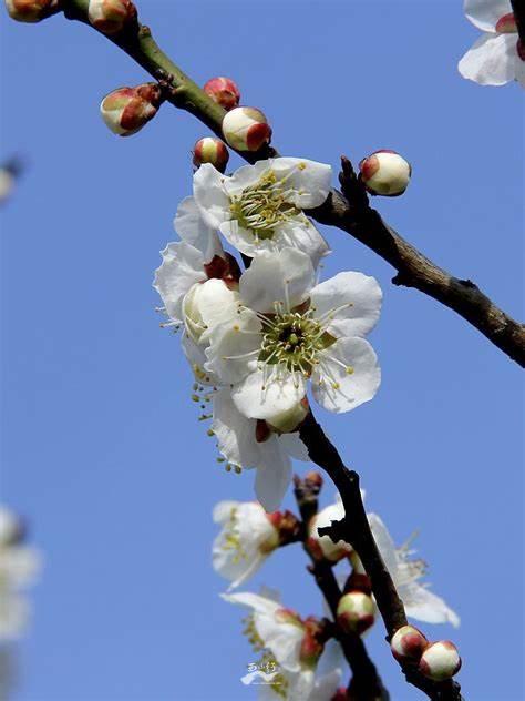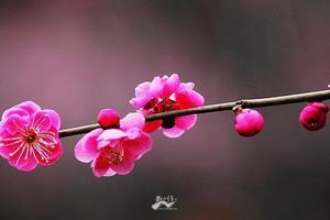 梅(Prunus mume Siebold & Zucc.):蔷薇科、李属木本植物。小乔木,稀灌木,高4-10米;树皮浅灰色或带绿色,平滑;小枝绿色,光滑无毛。叶片卵形或椭圆形,叶边常具小锐锯齿,灰绿色。花单生或有时2朵同生于1芽内,直径2-2.5厘米,香味浓,先于叶开放;花萼通常红褐色,但有些品种的花萼为绿色或绿紫色;花瓣倒卵形,白色至粉红色。果实近球形,直径2-3厘米,黄色或绿白色,被柔毛,味酸;果肉与核粘贴;核椭圆形,两侧微扁。花期冬春季,果期5-6月。